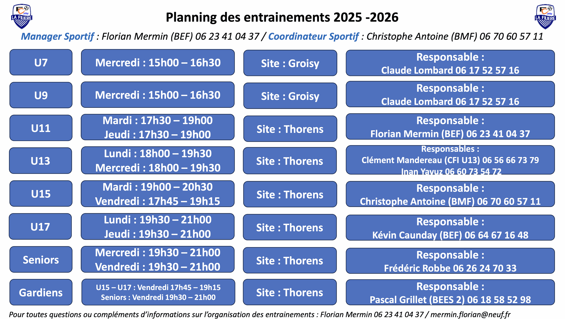 Voici le planning des entrainements :